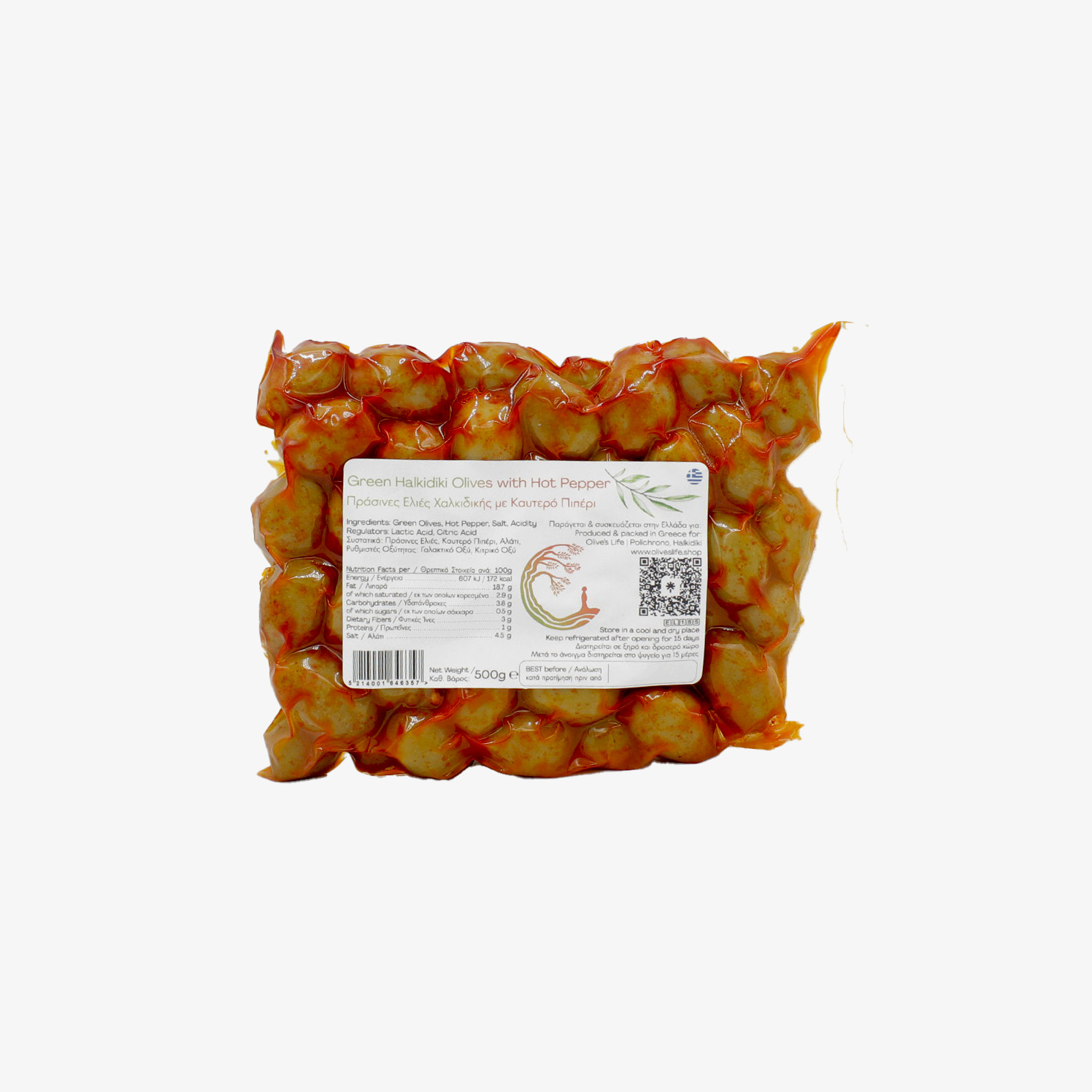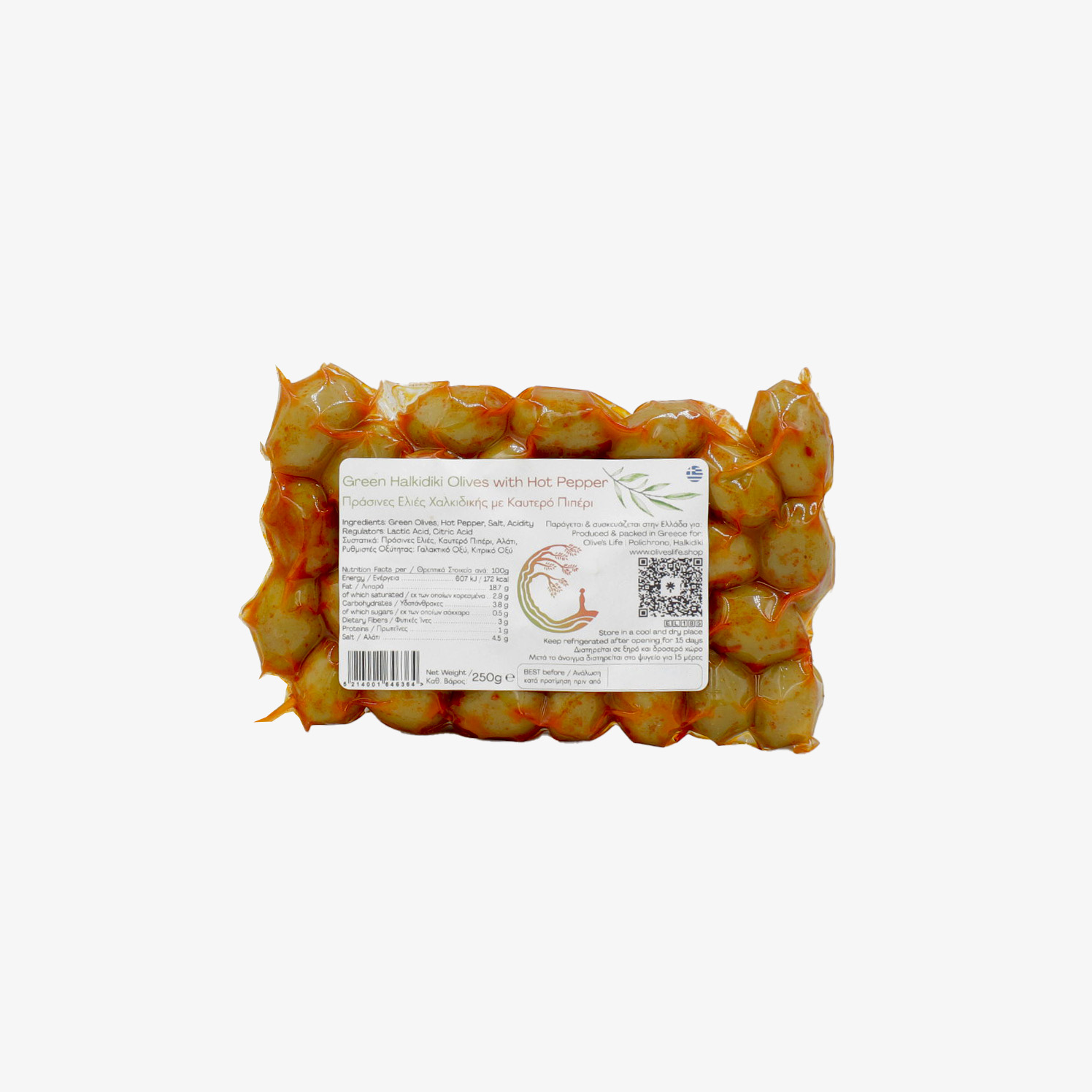 Green Halkidiki Olives are world famous and naturally produced in abundance in the region of Halkidiki. With them we create wonderful combinations with Oregano, Sweet or Hot Peppers, as well as with a variety of ingredients that contribute to a spicy mix, known as Ouzomeze.
