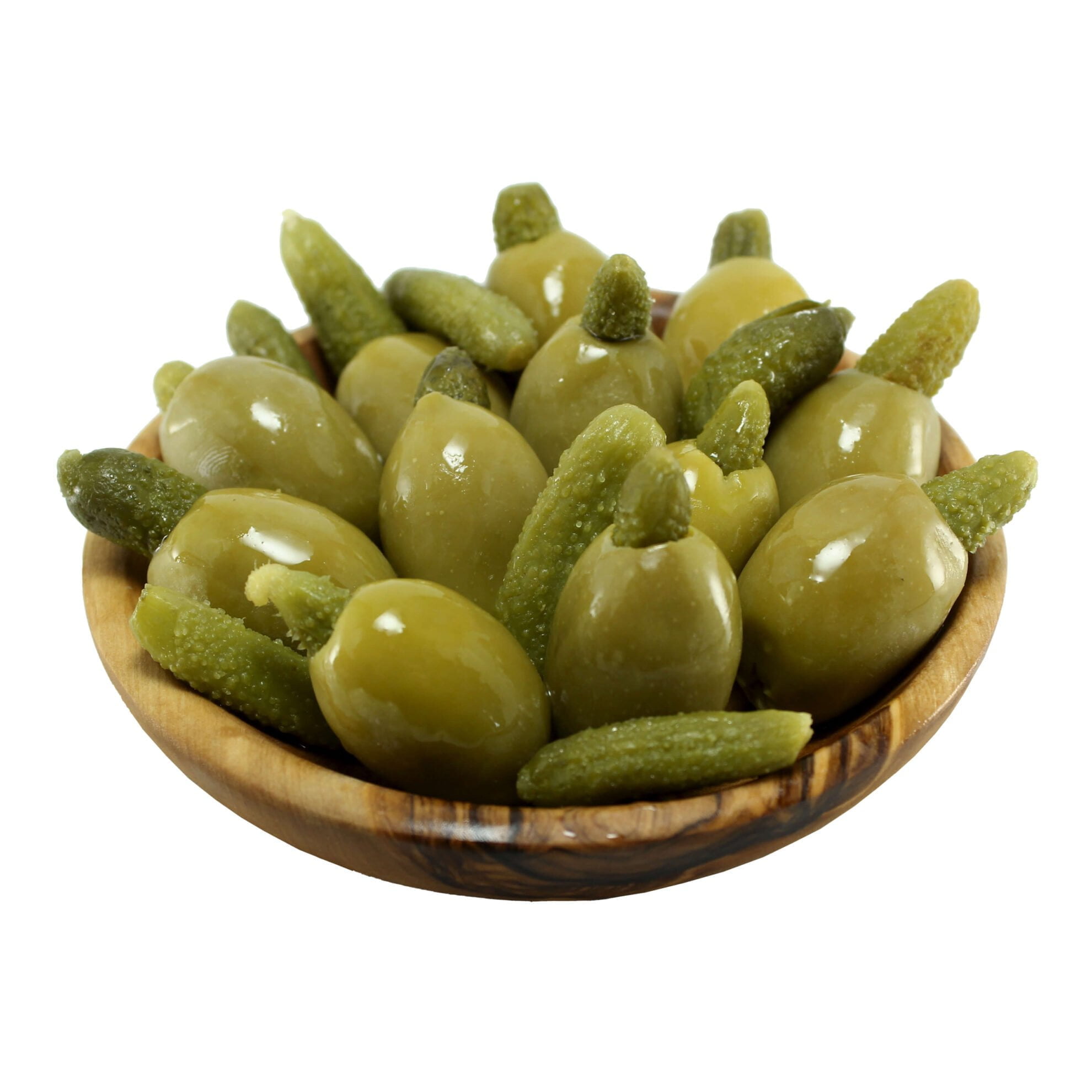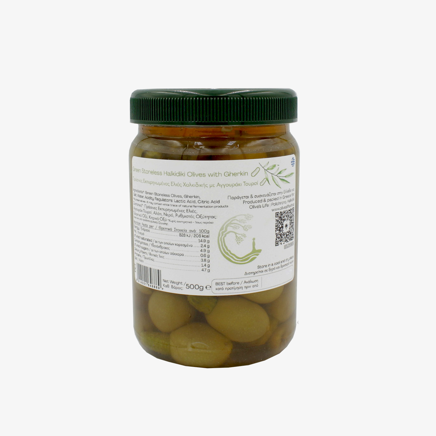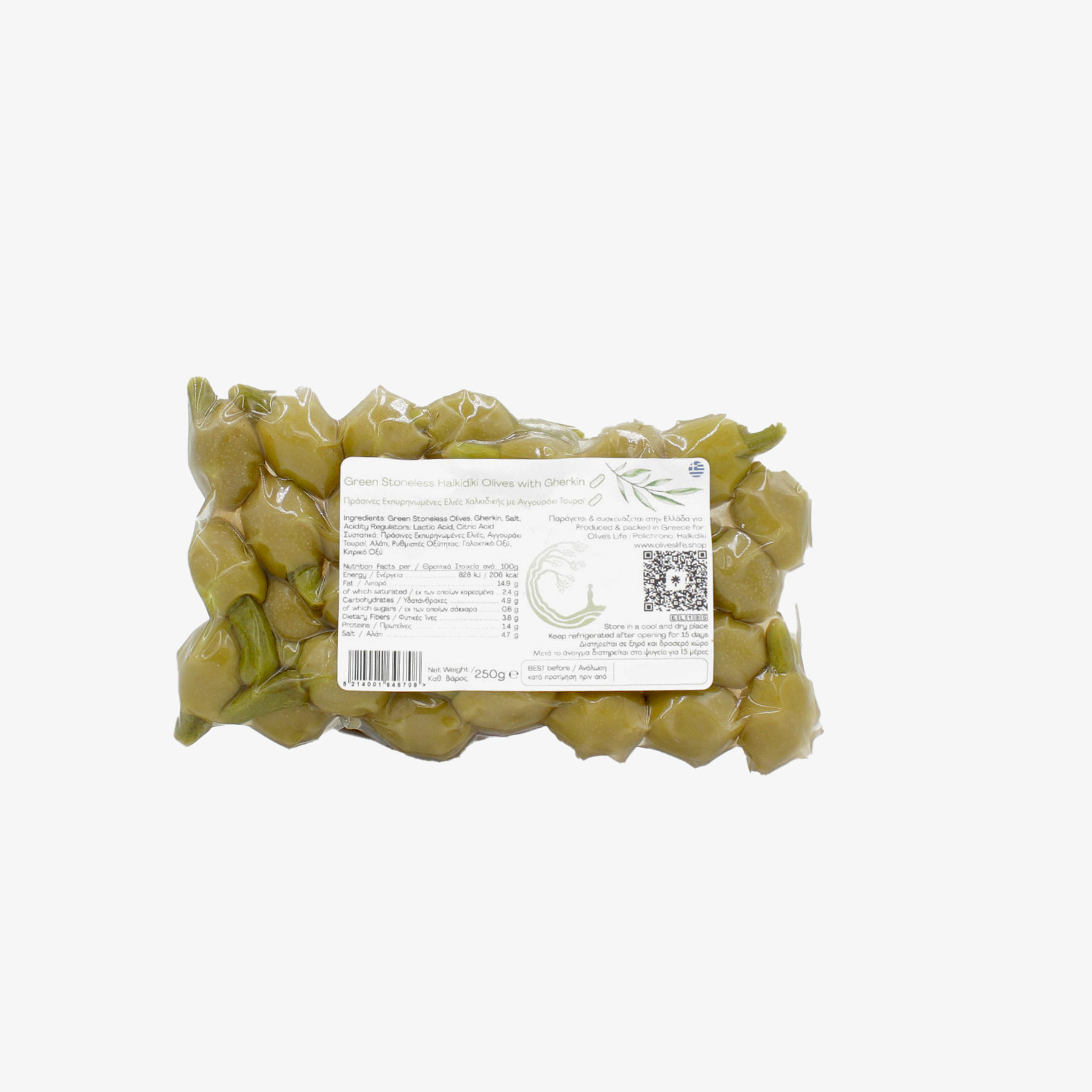 Green Halkidiki Olives are world famous and naturally produced in abundance in the region of Halkidiki. Enucleation is a process where we remove the core or pit from the olive. In this way, the Stoneless Green Olives are obtained, i.e. the Green ones without a core. With them we create wonderful combinations with Orange, Piri Piri, Almond, Gherkin and with Garlic and/or Florina Pepper.