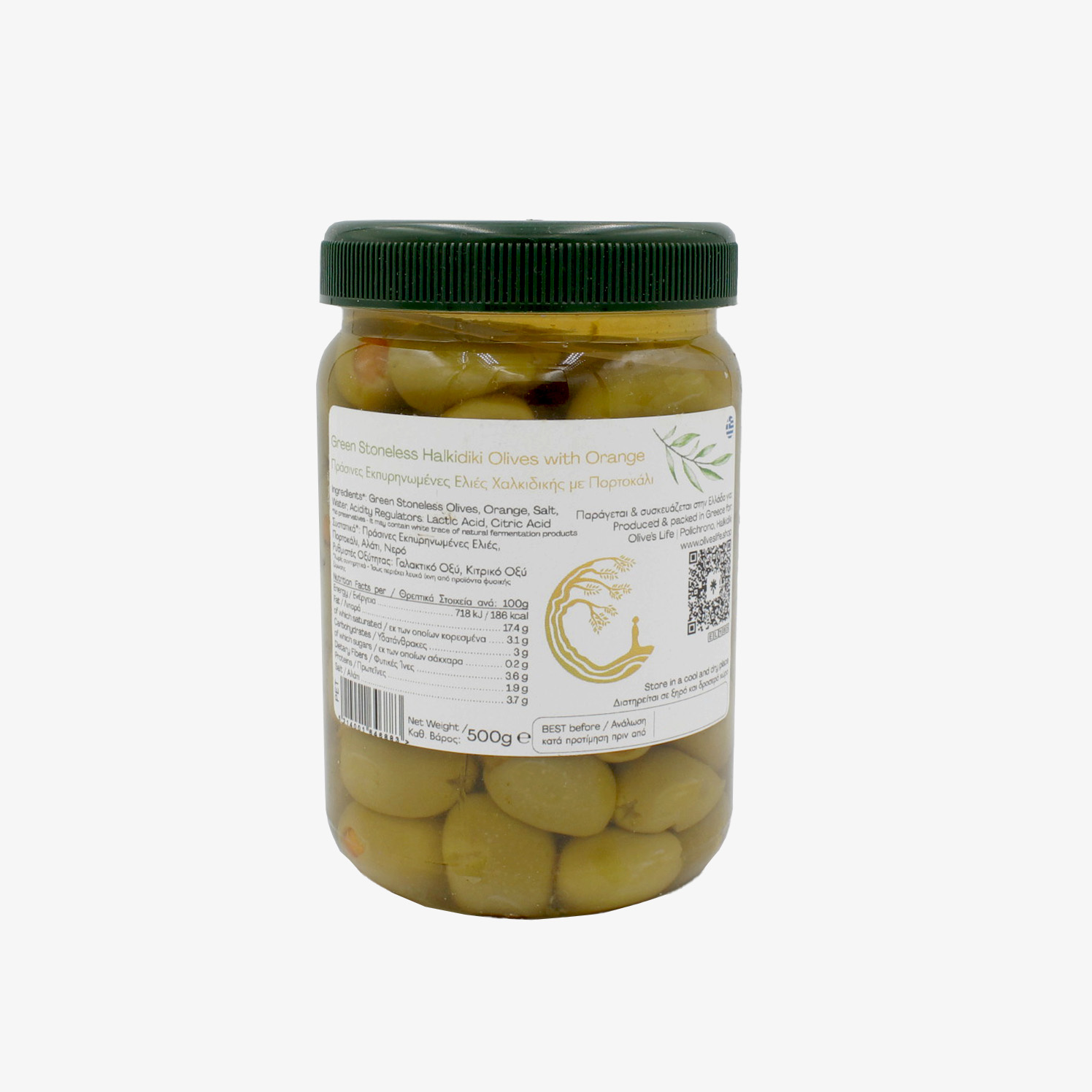 Ingredients: Halkidiki Green Olives, Orange, Salt, Citric & Lactic Acid, Water*.