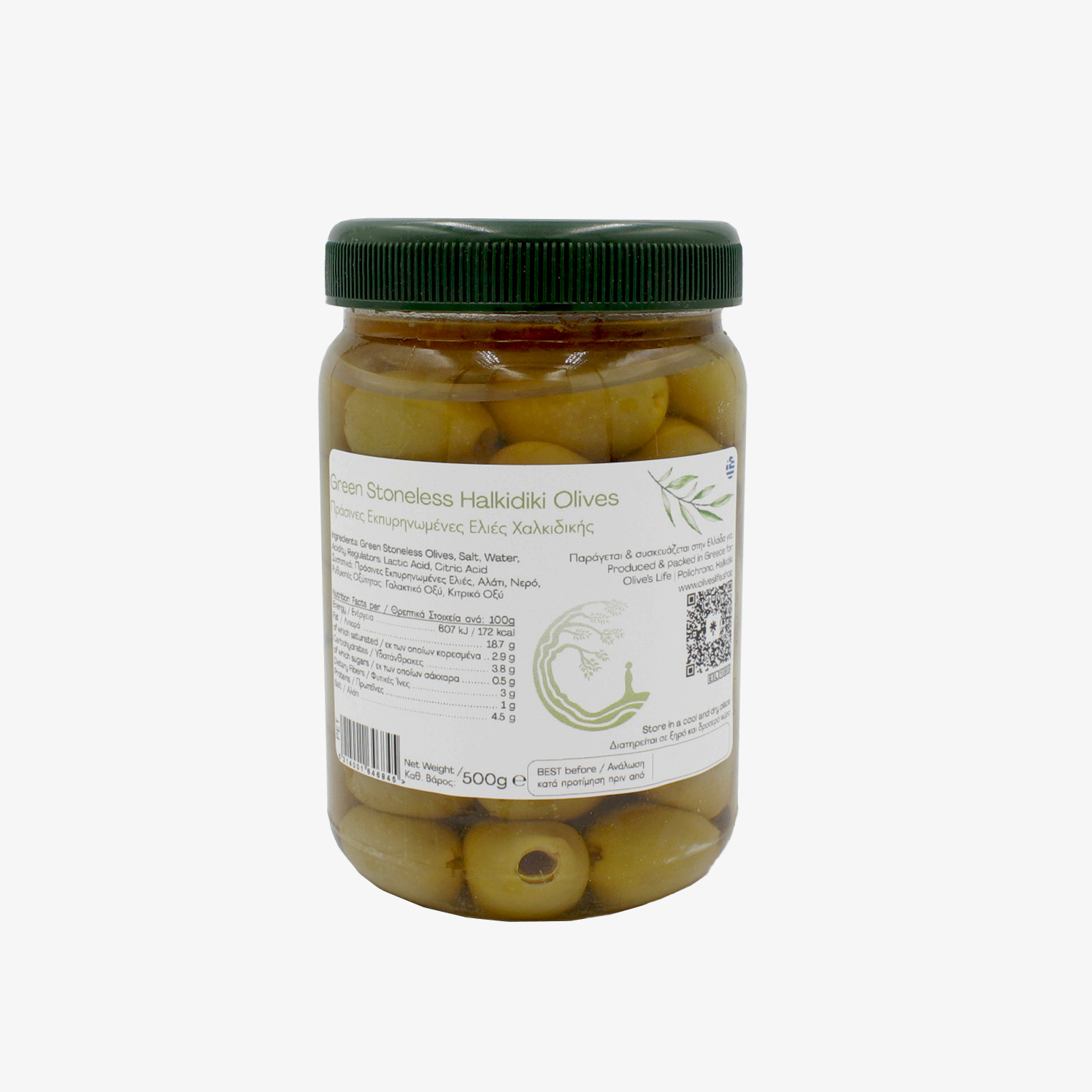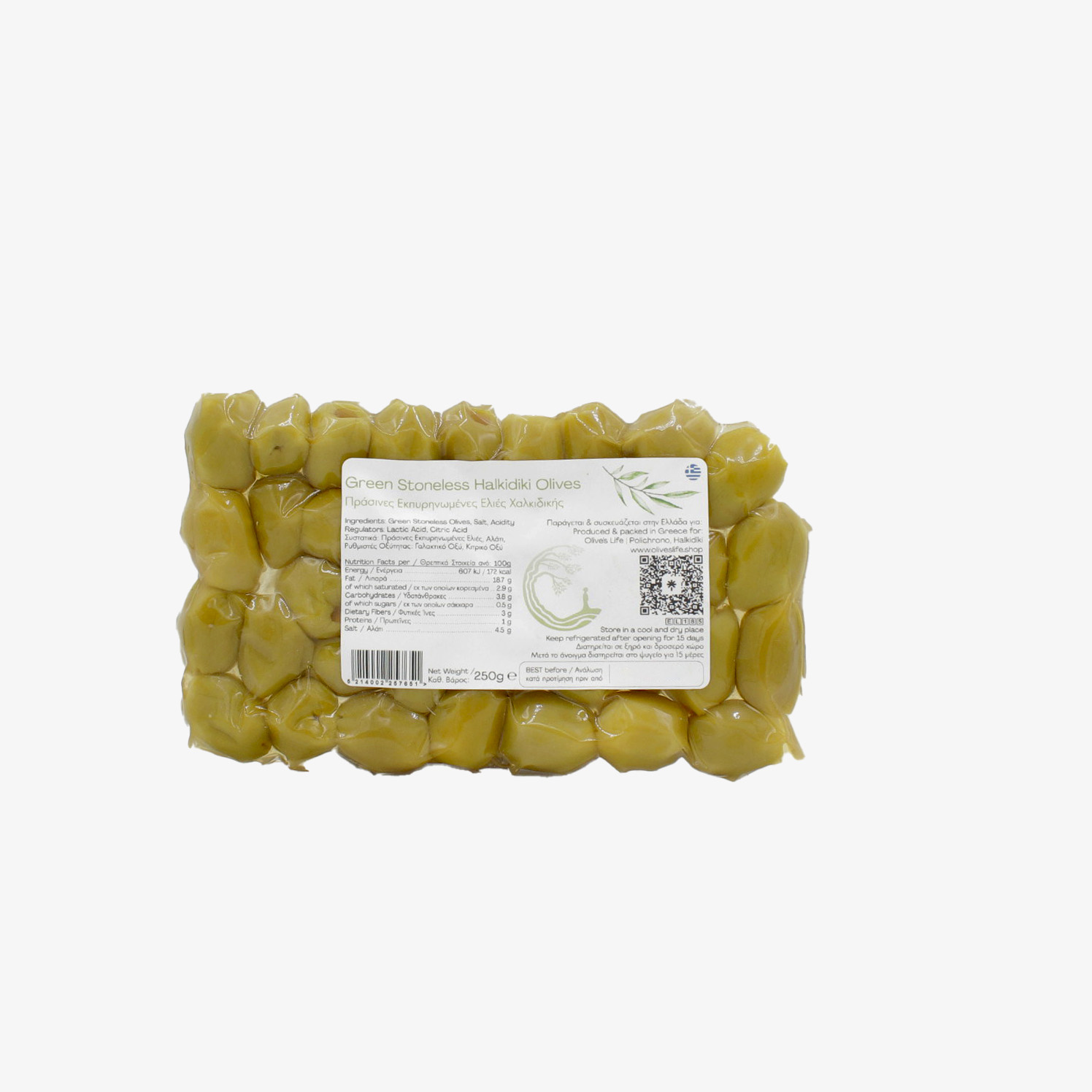 Green Halkidiki Olives are world famous and naturally produced in abundance in the region of Halkidiki. Enucleation is a process where we remove the core or pit from the olive. In this way, the Stoneless Green Olives are obtained, i.e. the Green ones without a core. With them we create wonderful combinations with Orange, Piri Piri, Almond, Gherkin and with Garlic and/or Florina Pepper.