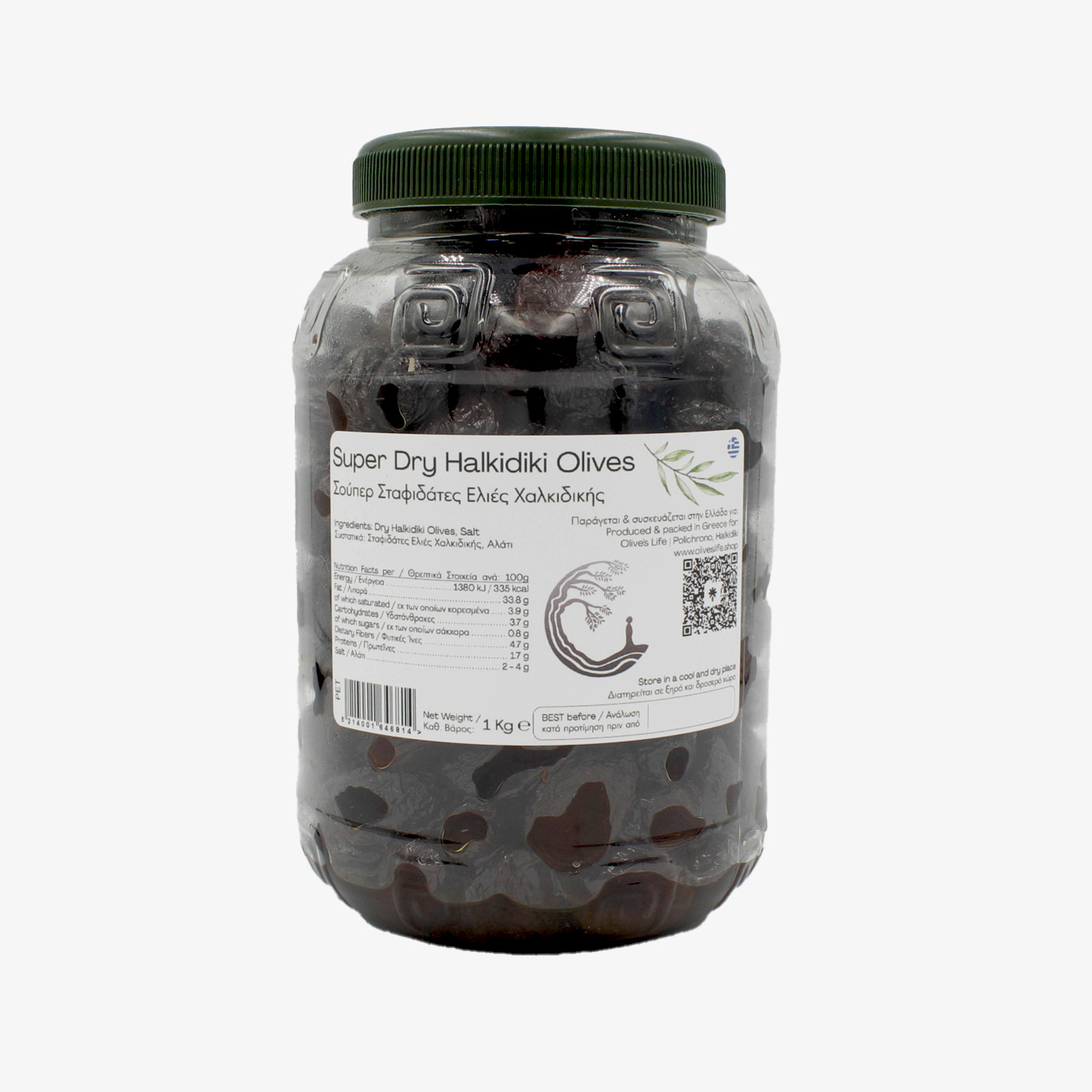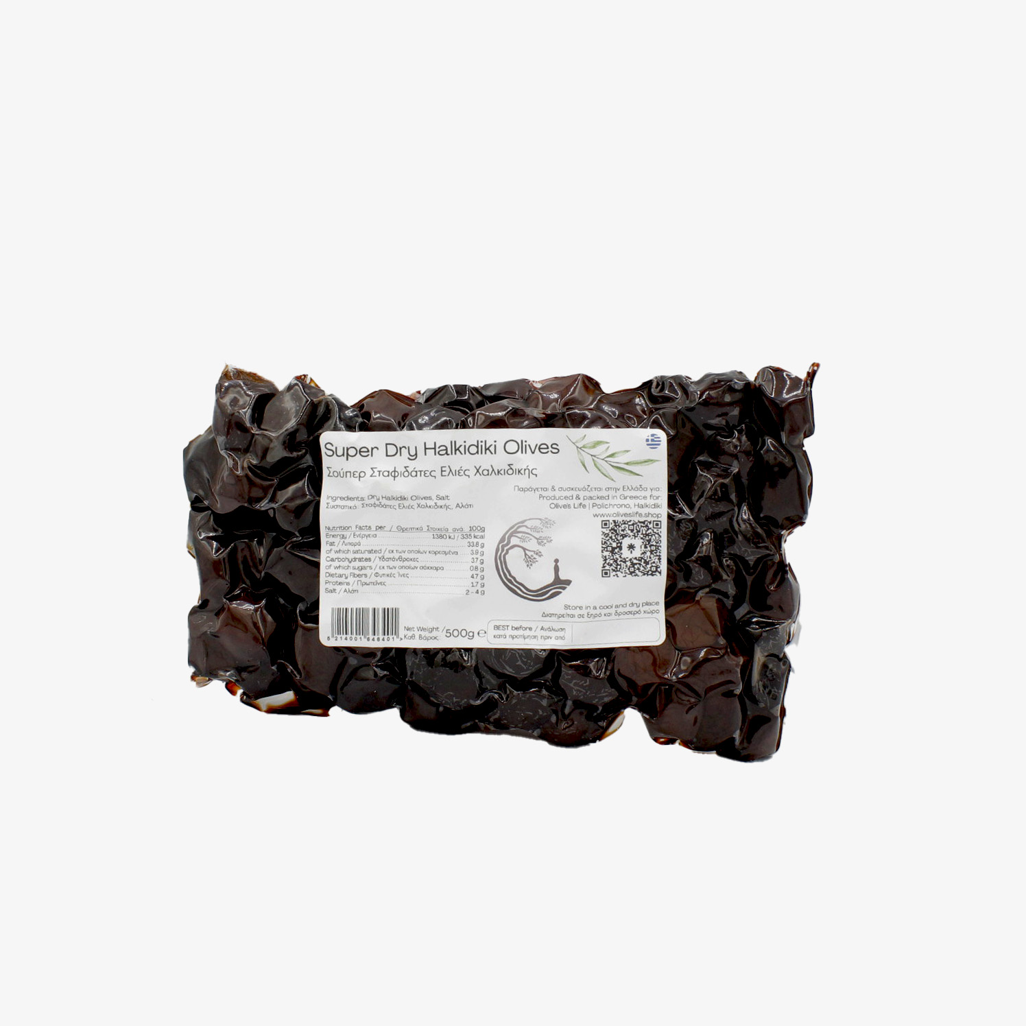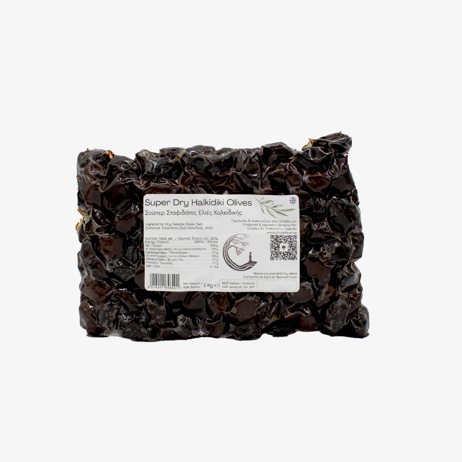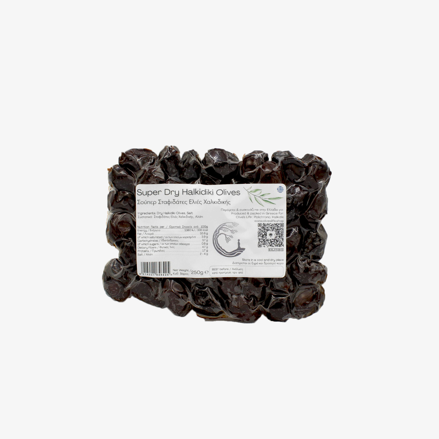 The Super Dry Halkidiki Olives are practically wrinkled Halkidiki olives and are of course a local product in the prefecture of the same name.